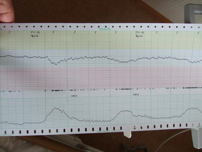 NSTの機械をつけて陣痛の波をチェック。