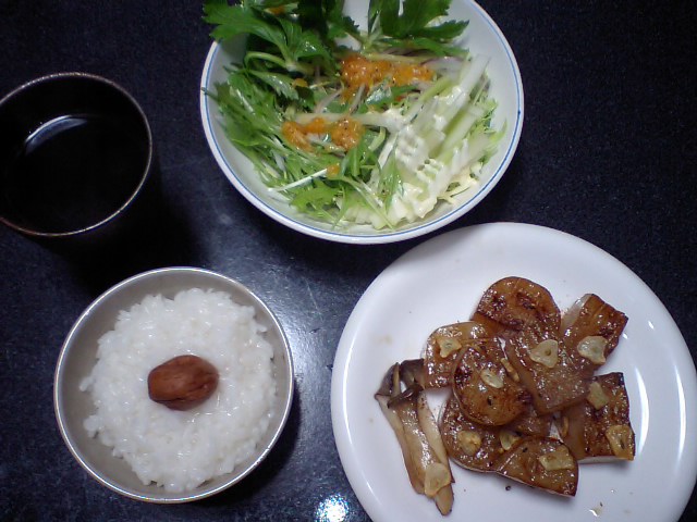 こんにゃくステーキとサラダとおかゆにうめぼし(笑)